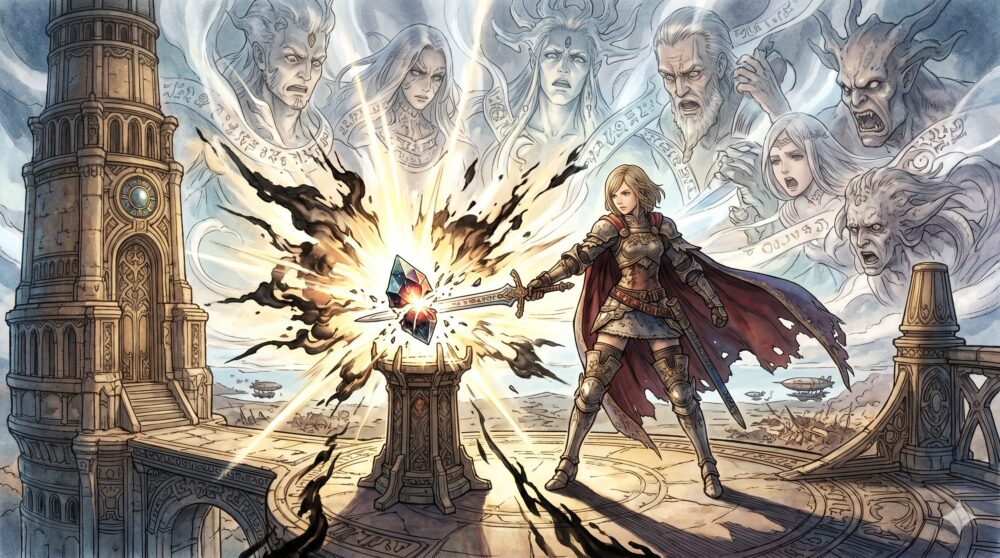 アーシェの心は激しく揺れ動きます。 破魔石を使えば、帝国を焼け野原にして夫の仇を討ち、国を取り戻せる。しかし、それは大量破壊兵器を使うことを意味し、新たな悲劇を生むことになります。彼女は「復讐鬼になるか、王として民を守るか」という重い選択を突きつけられます。