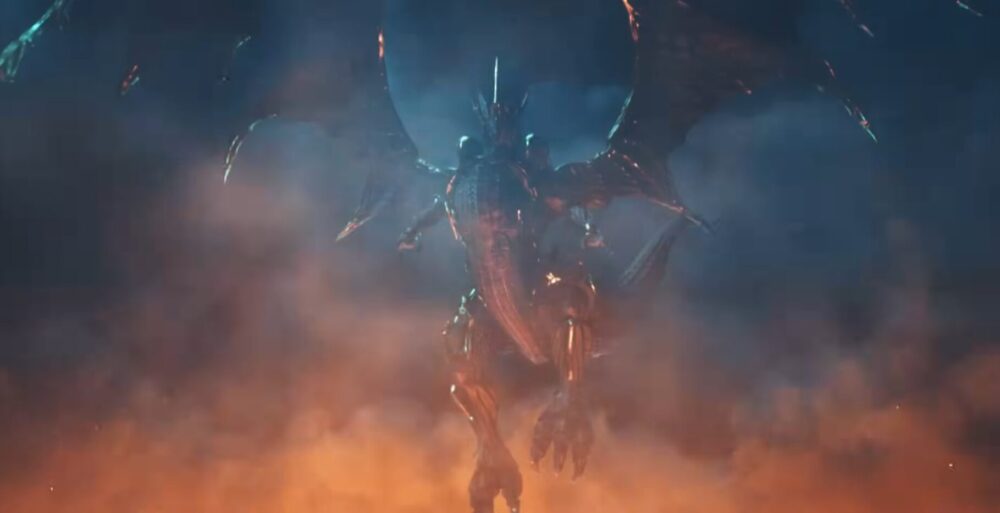 激しい戦闘の最中、ついに悲劇が起こります。 大地に激突するかに見えたダラガブが空中で砕け散り、その中から巨大な黒い竜——古の蛮神「バハムート」が姿を現したのです。